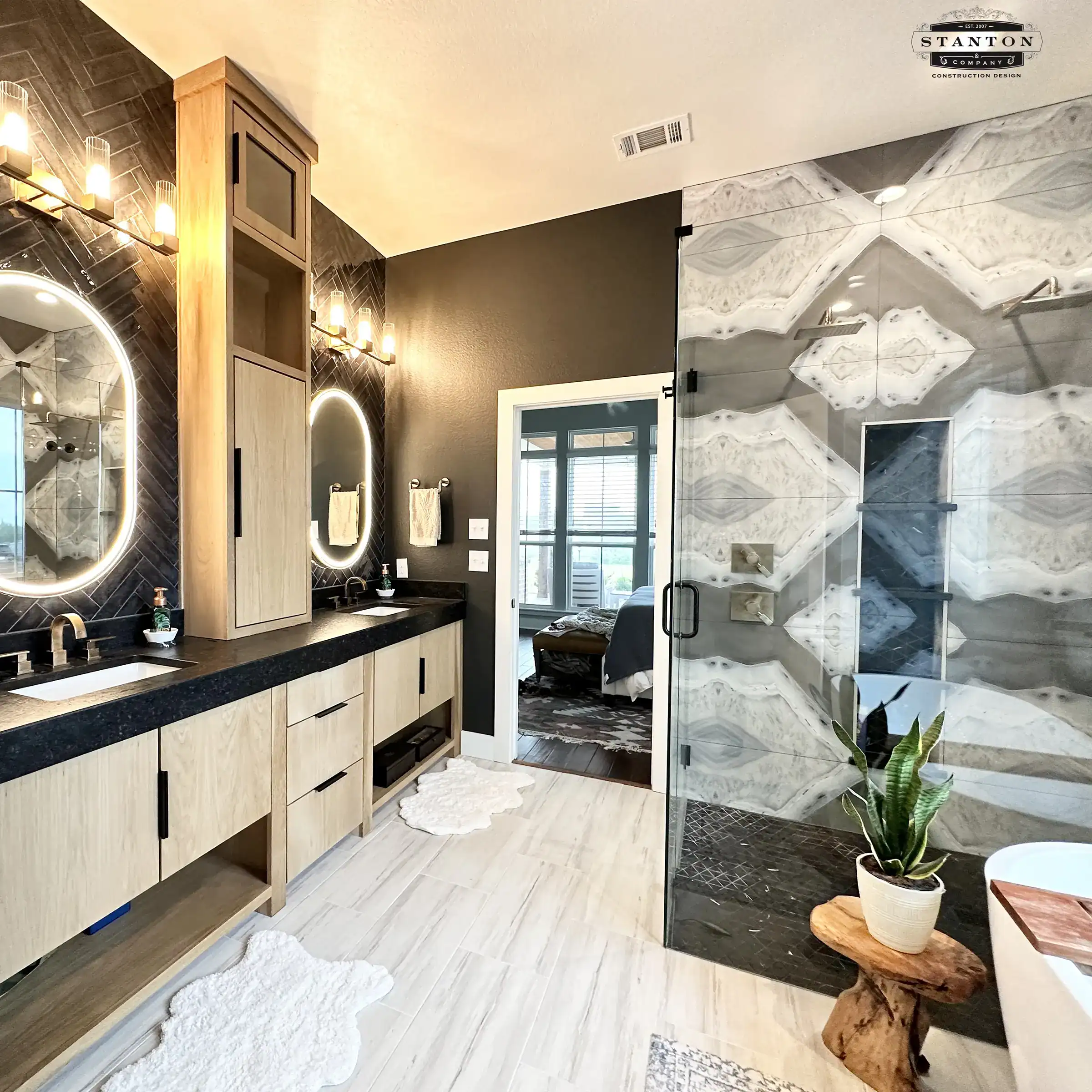 A full gut renovation rebuilds the bathroom from the studs out. Layouts get reconfigured, walls may move, footprints might expand into adjacent closets or rooms, and plumbing gets relocated. This is where you see freestanding soaking tubs, curbless walk-in showers with multiple heads and body sprays, double vanities with custom cabinetry, heated tile floors, and premium materials like marble, quartzite, or large-format porcelain running wall to wall. We’ve built projects at this level for clients in Aledo, Keller, Willow Park, and Fort Worth who wanted an owner’s suite bathroom that felt like a private retreat. The combinations we’re seeing most often in 2026 blend brushed gold fixtures, marble-look porcelain, frameless glass, and warm custom wood vanities.