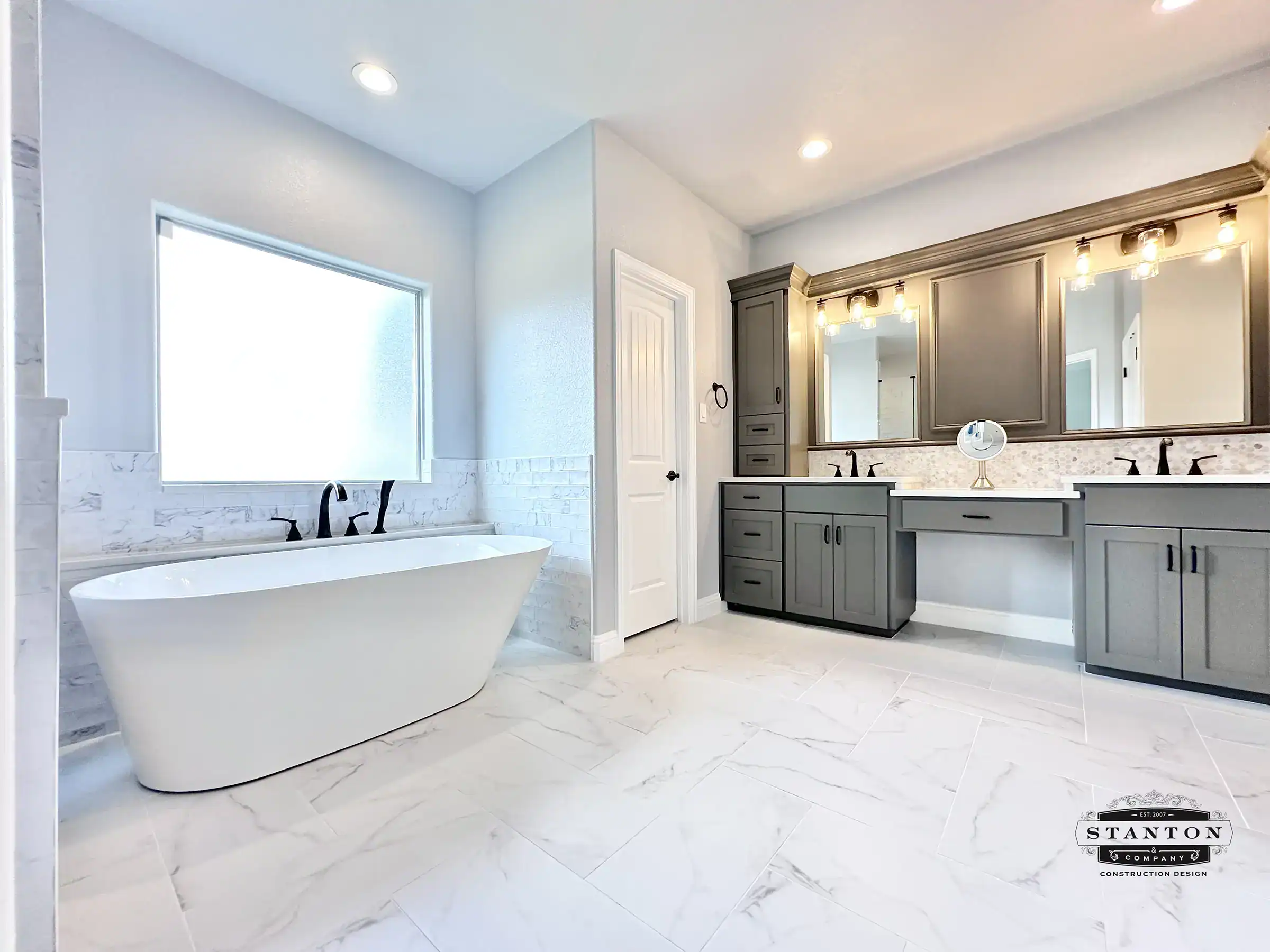 A recent primary bathroom project in Aledo included removing a confined, small shower and relocating it to the space where we removed a large garden tub.  New plumbing and a relocated drain was required to accommodate the new location.  We built two pony walls with a center entrance and topped with frameless glass. There was a large window over the former garden tub.  We shrunk the window size and raised the sill to take advantage of the indirect natural light.  The former shower location became a large floor to ceiling linen closet with many shelves and doors for ample storage. The two vanities were replaced with custom, shaker-style, painted cabinets with a quartz countertop. Within the vanities are hidden outlet drawers. Recessed lights were added, as well as new vanity lighting.  An updated exhaust fan was also added. Both vanities got new mirrors.  There is new tile in the shower and on the bathroom floor. The entire bathroom was painted. The total investment was just under $43,000. For Stanton & Co, this cost falls on the upper end of a mid-range bathroom remodel.