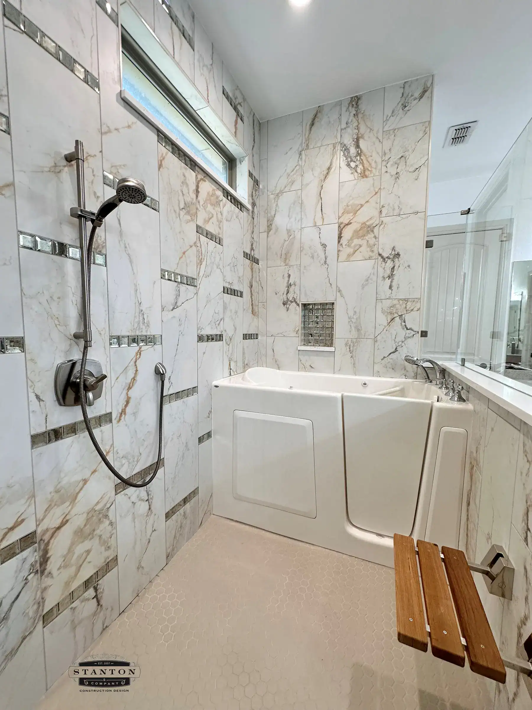For every bathroom remodel, Stanton & Co meets with each homeowner to assess their needs. Homes that require special considerations for an accessible bathroom need the homeowner or caregiver to specify their exact requirements, and we will build to that specification.  For a person needing to renovate to allow them to “age-in-place,” a conversation with the end-user or their caregiver is best to ascertain all requirements.  Whether it’s simply extra space, curbless entry, and grab bars, or an enlarged bench and turning radius within the shower, or a walk-in tub, we work to accommodate the specific needs of each homeowner. Accessible design isn’t a template — it’s a conversation about how you or your loved one actually uses the space, and we build around those details.